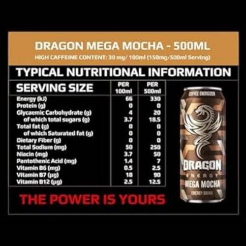 Awaken your senses with Dragon Mega Mocha Flavoured Energy Drink 6x500ml. The bold, rich taste of mocha coffee blends perfectly with the energizing kick of caffeine, taurine, and B-vitamins. Each sip delivers a smooth, chocolatey-coffee flavor while fueling your body and mind with the stamina you need to conquer your day.